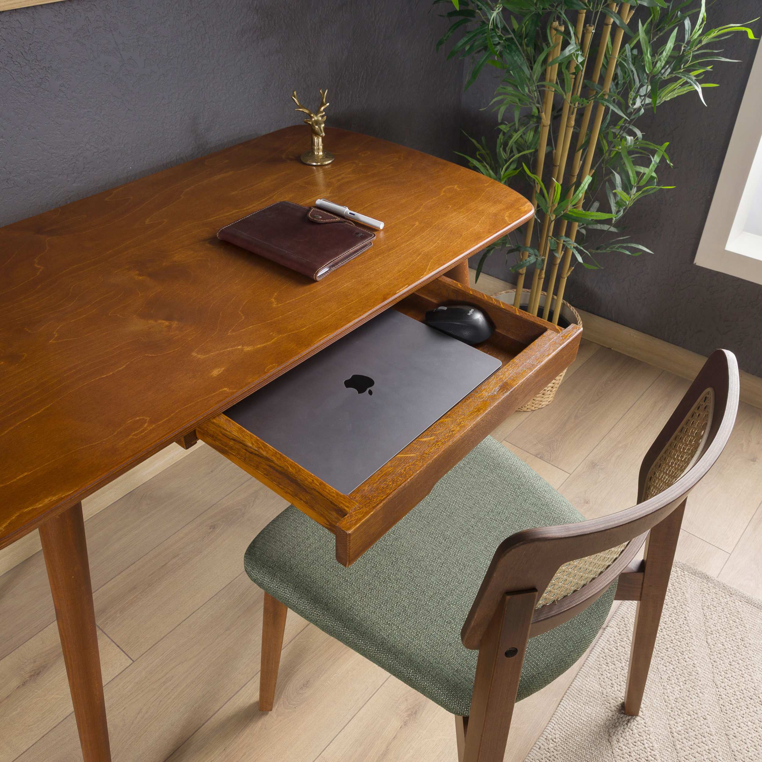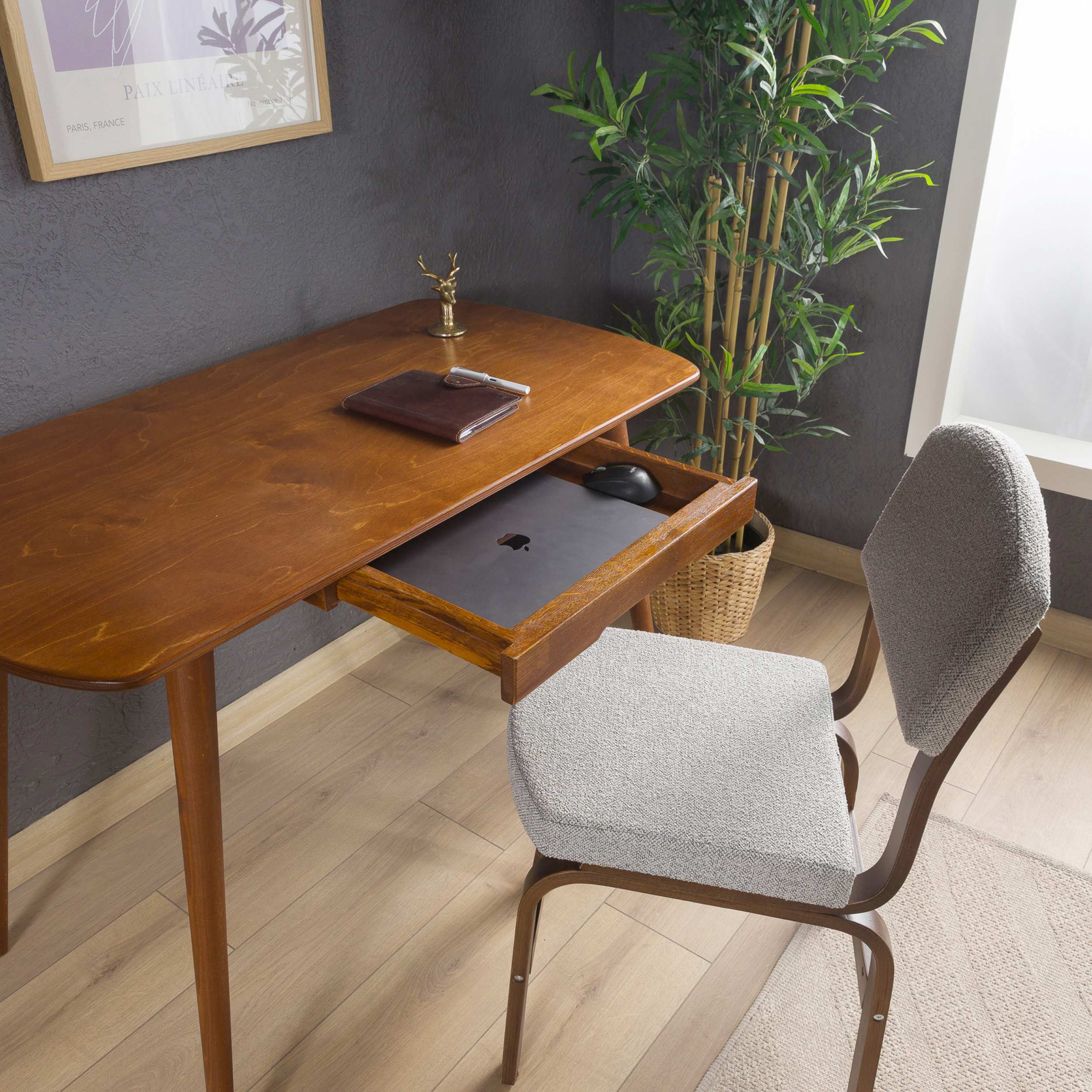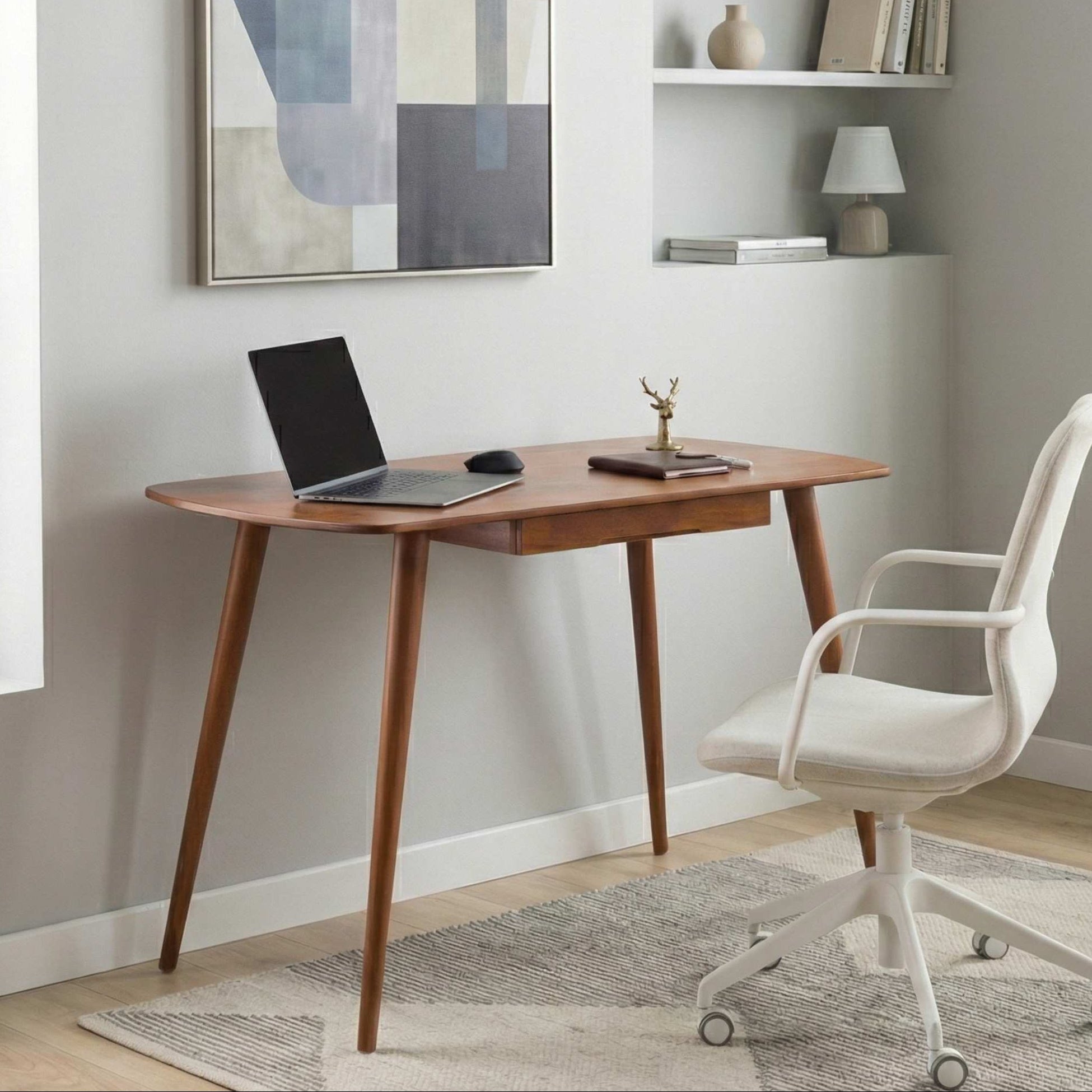 Built from premium birch plywood with solid beech wood legs, it includes a flush-integrated drawer that keeps daily essentials off the surface. Available in Chestnut or Walnut, in two sizes from 39" to 45.3" wide—compact enough for a bedroom, capable enough for a full work setup.