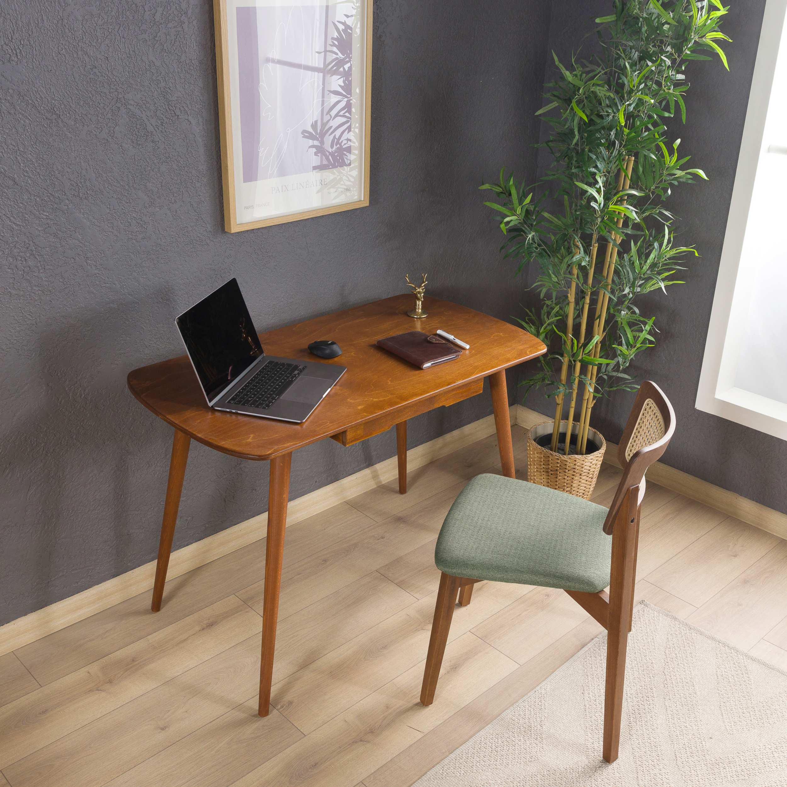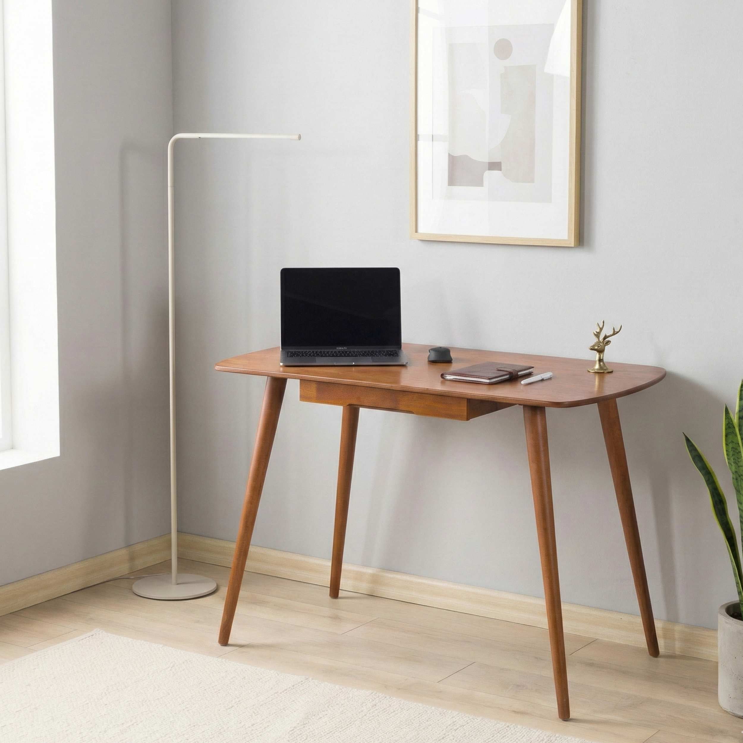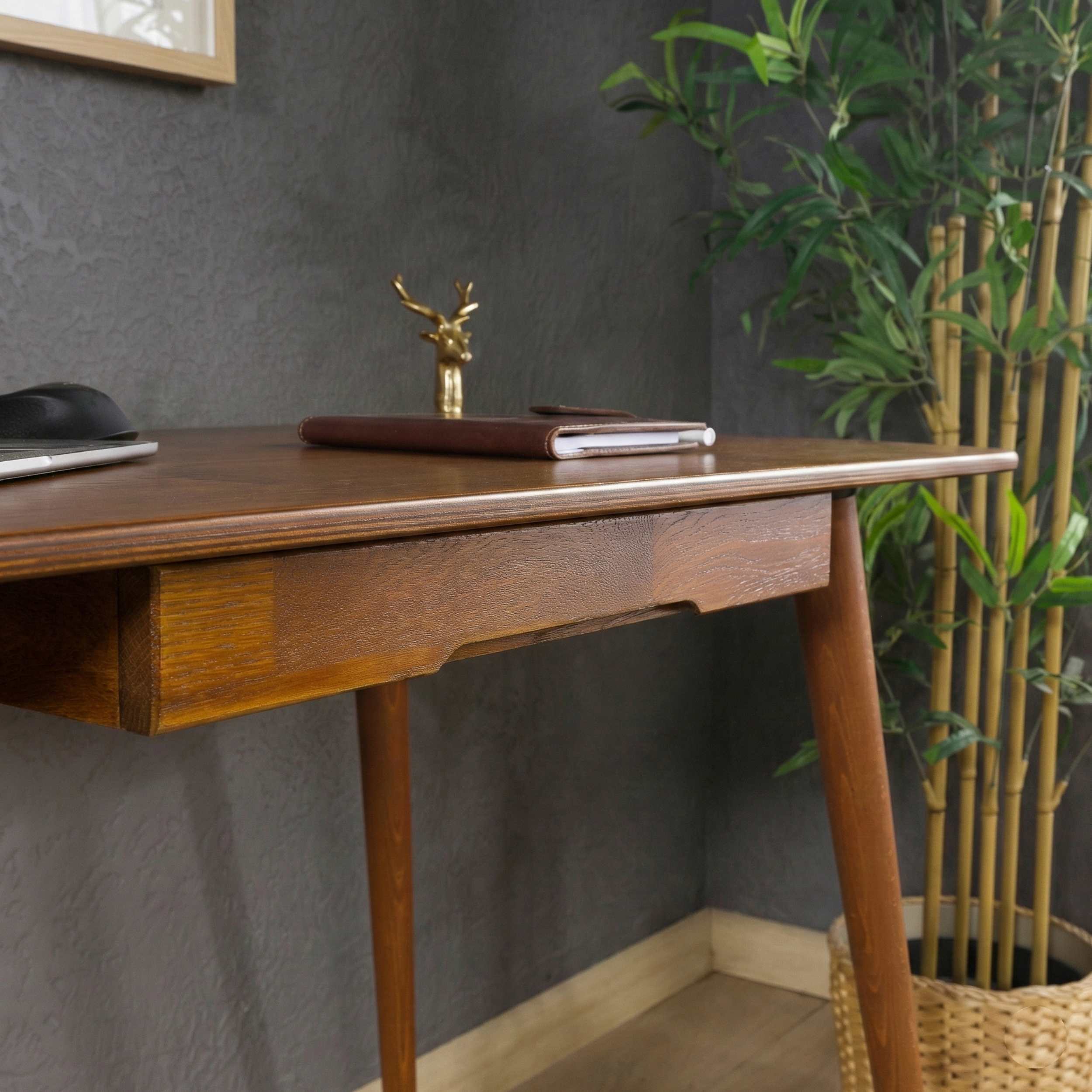 Built from premium birch plywood with solid beech wood legs, it includes a flush-integrated drawer that keeps daily essentials off the surface. Available in Chestnut or Walnut, in two sizes from 39" to 45.3" wide—compact enough for a bedroom, capable enough for a full work setup.