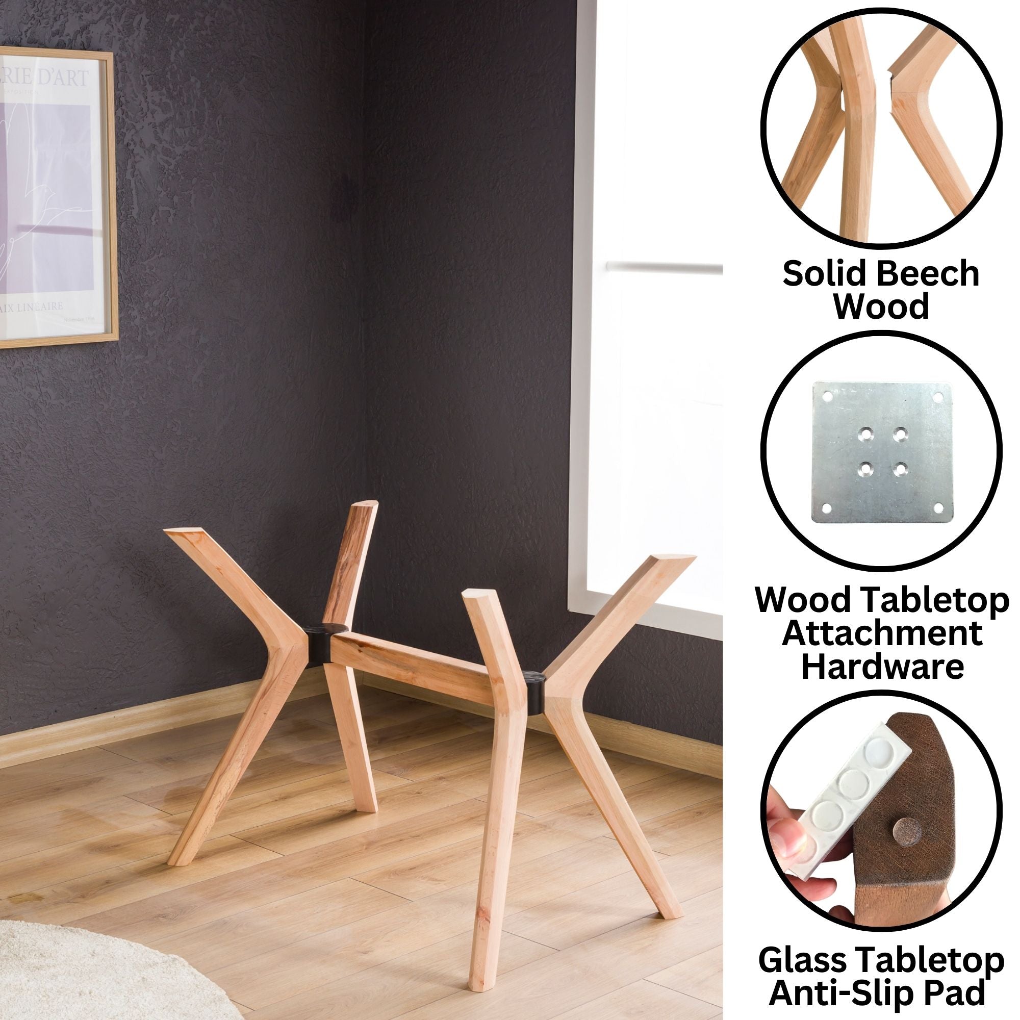 Gestalten Sie mit unserem 4-Bein-Tischgestell aus Holz einen Tisch ganz nach Ihrem Stil. Ob zum Essen, Arbeiten oder Präsentieren – dieses Untergestell bietet die perfekte Kombination aus Eleganz, Funktionalität und Individualisierung für Ihr nächstes Designprojekt.