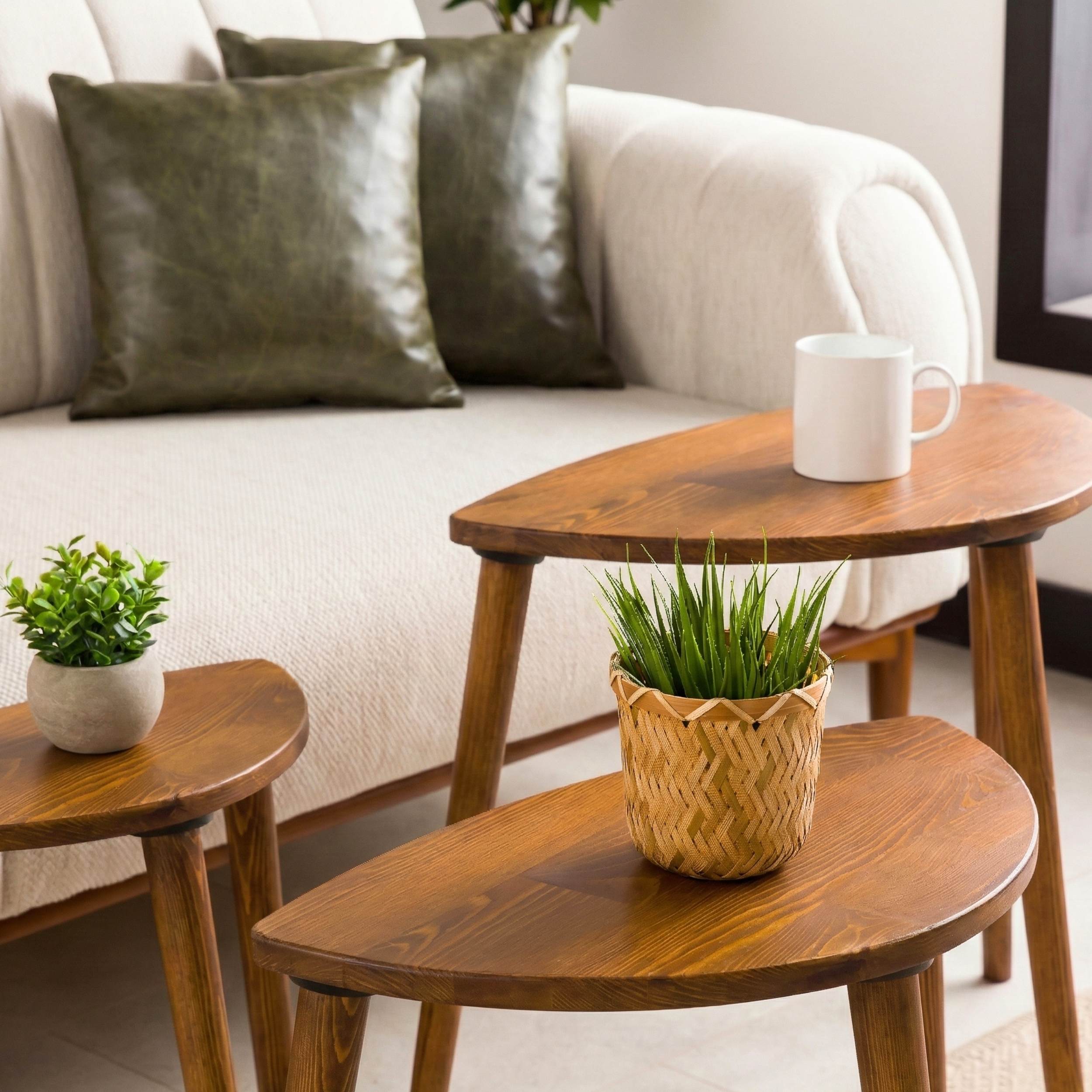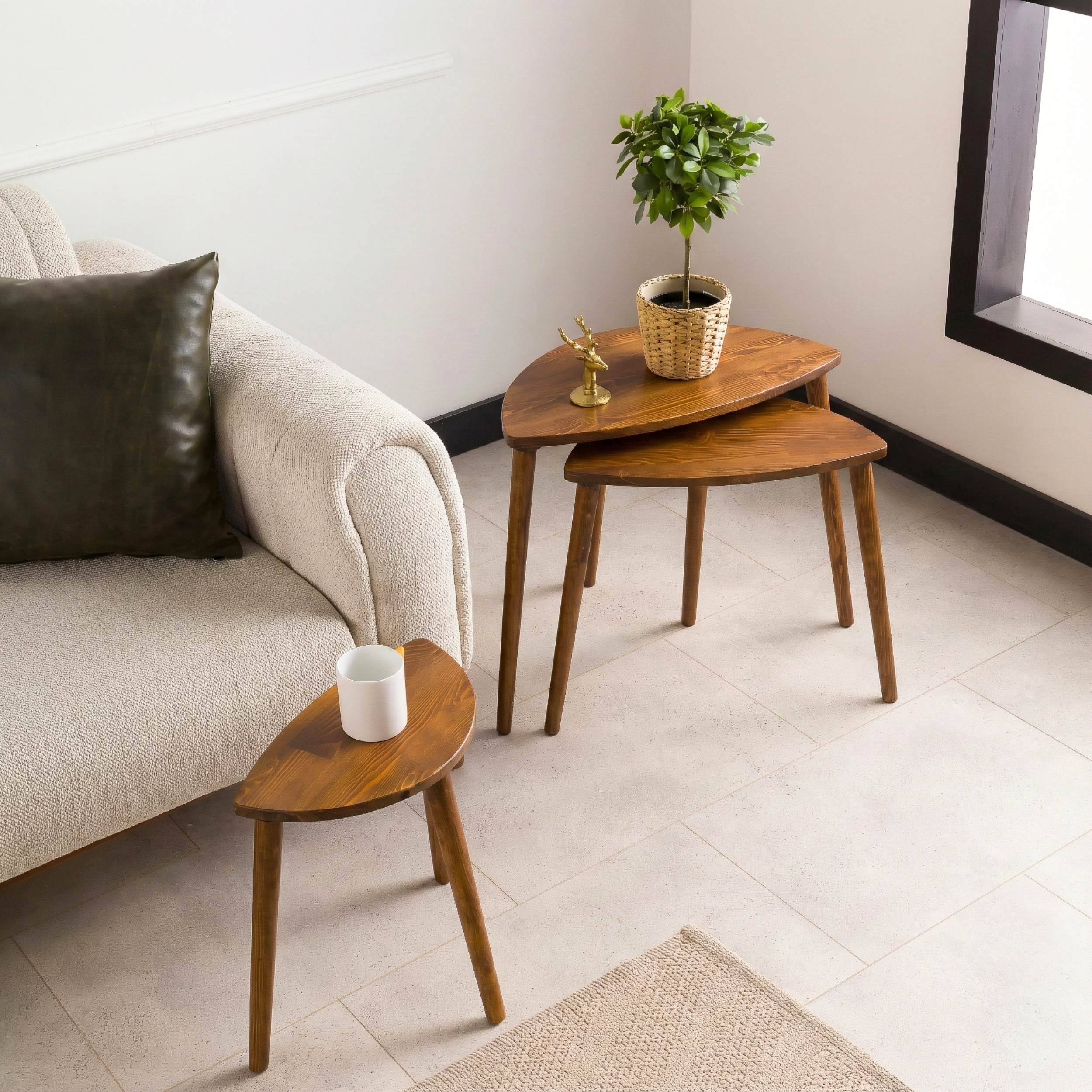 Bring warmth, character, and adaptable style into your home with this handcrafted nesting table set, thoughtfully shaped from solid pine wood. Its mid-century modern curves pair effortlessly with contemporary or classic interiors, while the tiered, space-saving design offers total flexibility. Whether used together as a sculptural centerpiece or separated throughout your home, these tables bring functionality and organic beauty to any room.