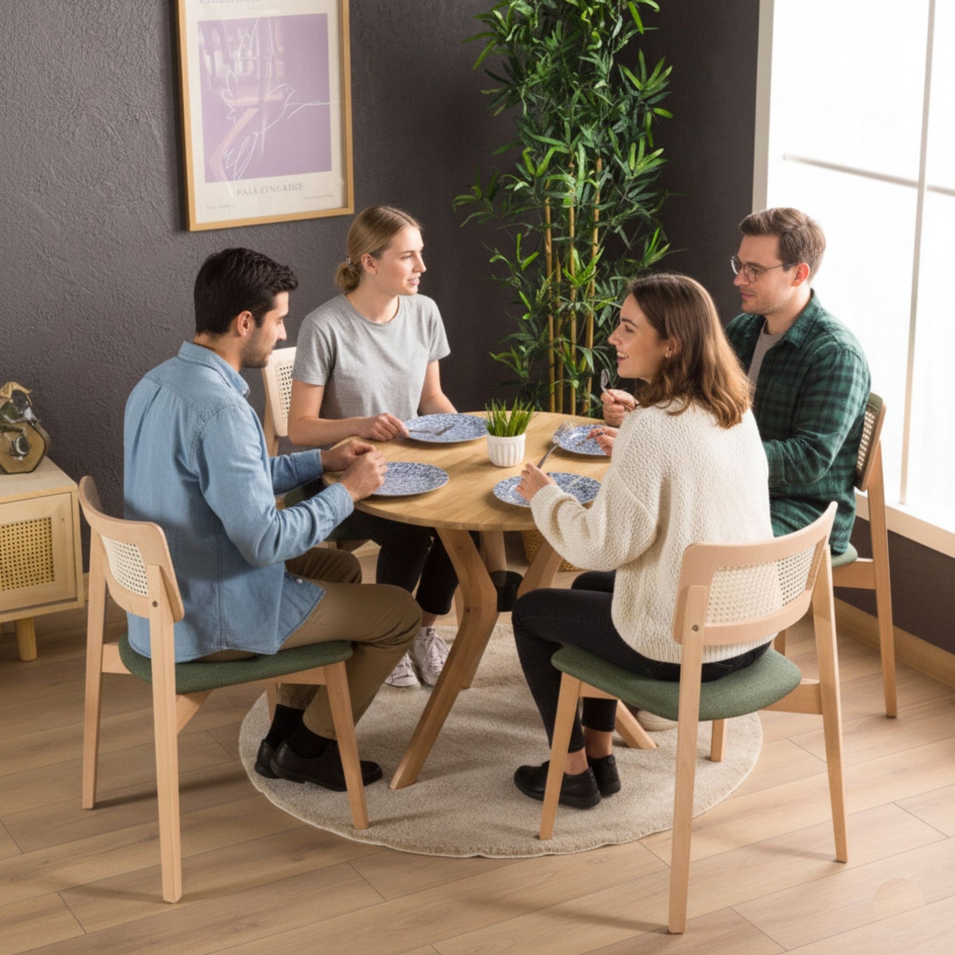Solid Wood Round Dining Table Set with Beech & Rattan Chairs – Handcrafted Elegance for Every Space (Set of 2–6)