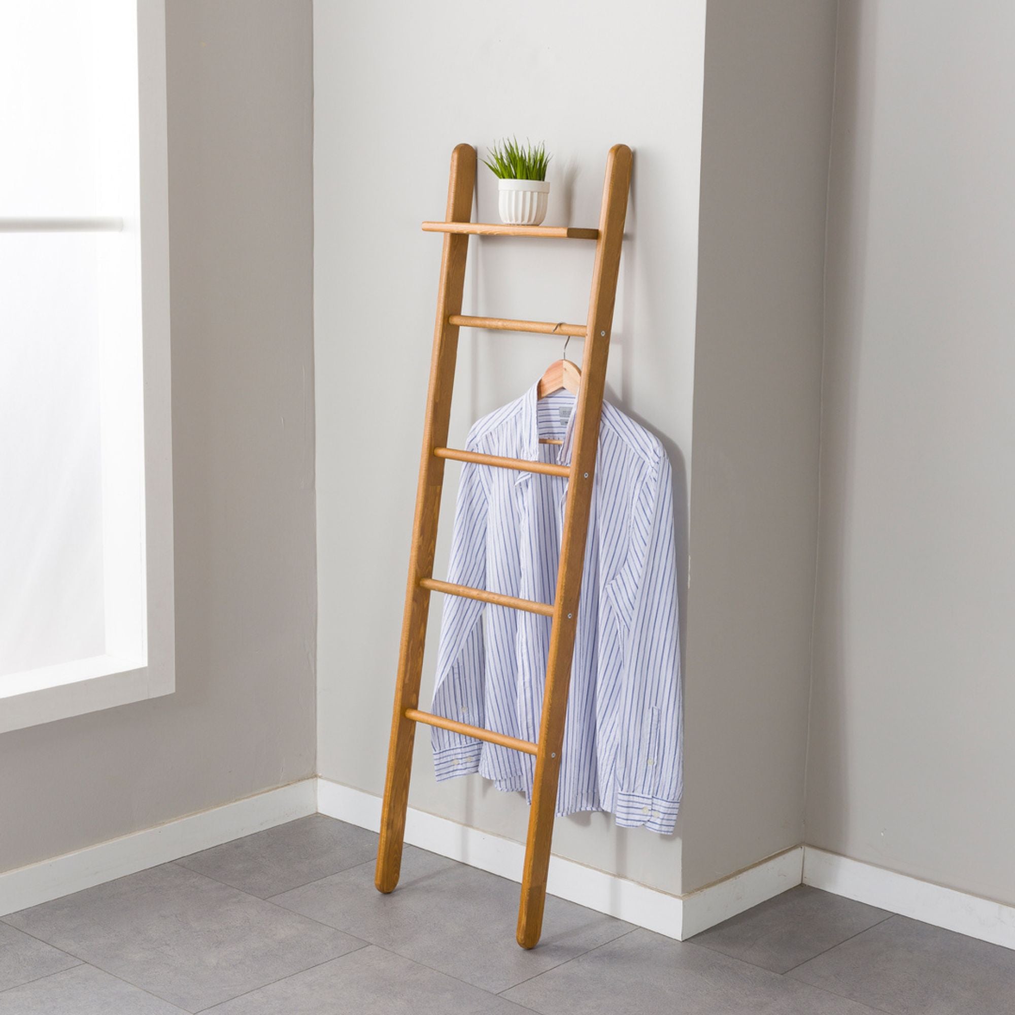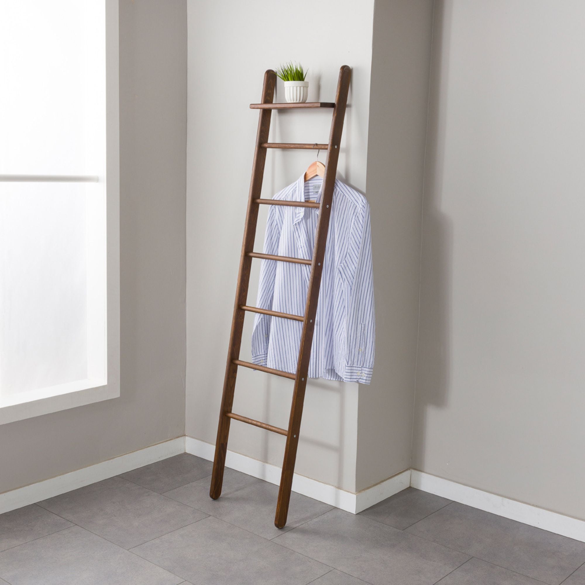 Thoughtfully spaced rungs offer versatile hanging options, while the included shelf adds functional display space.